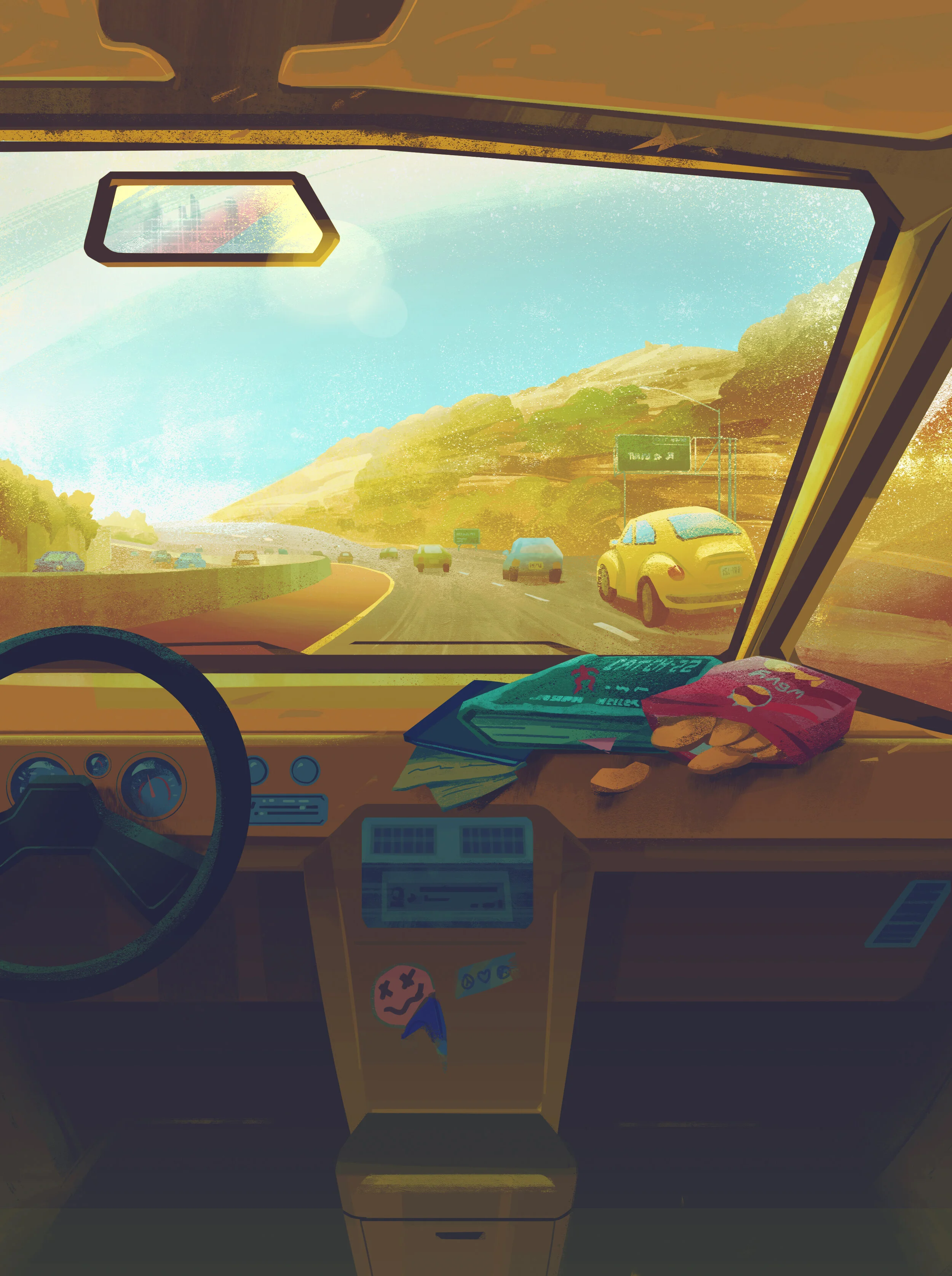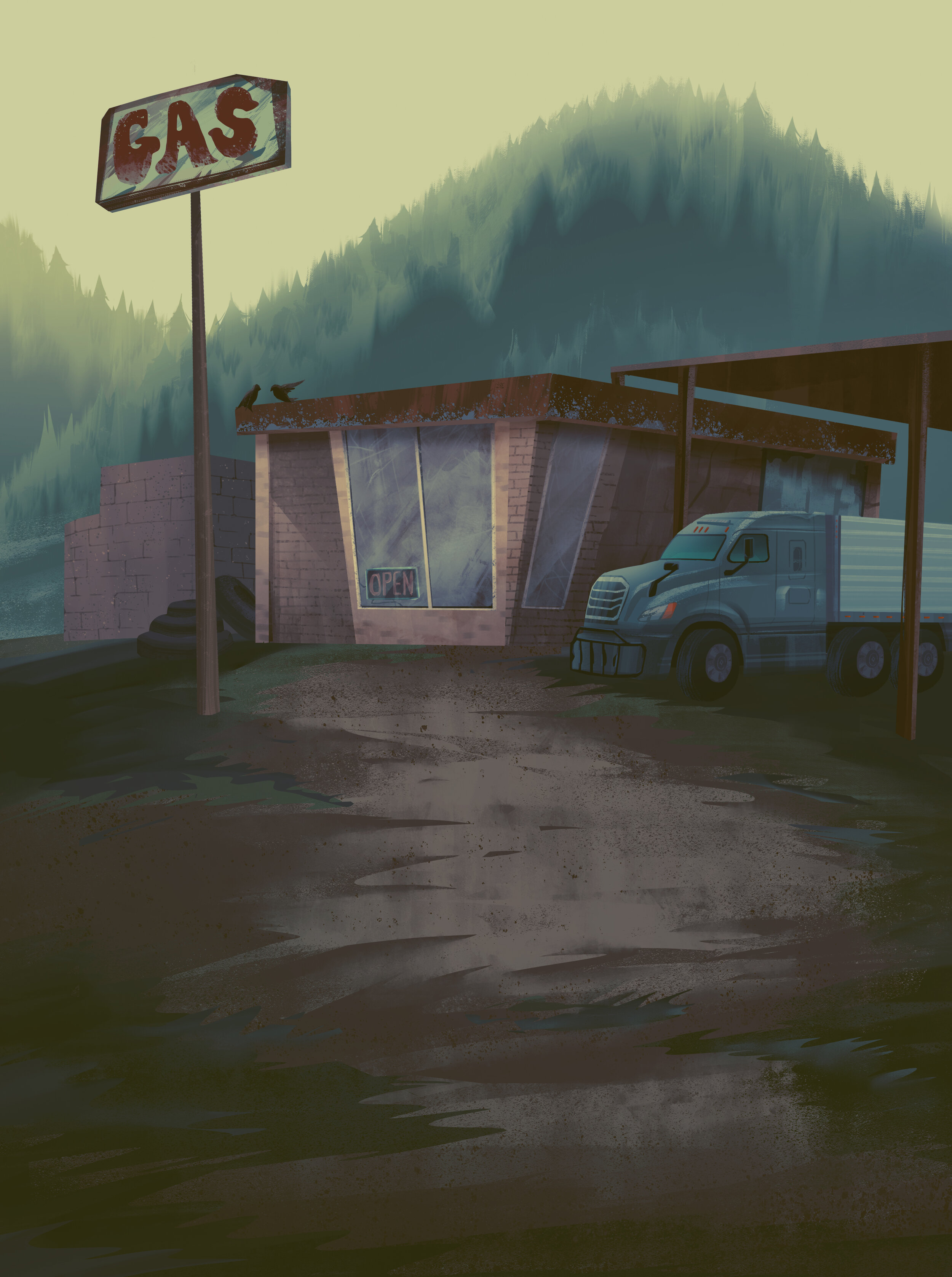 I designed backgrounds for the mobile dating game Roadkill, a romcom-horror story about four college students who find themselves in a wished upon apocalypse and have to make their way to the west coast to survive.